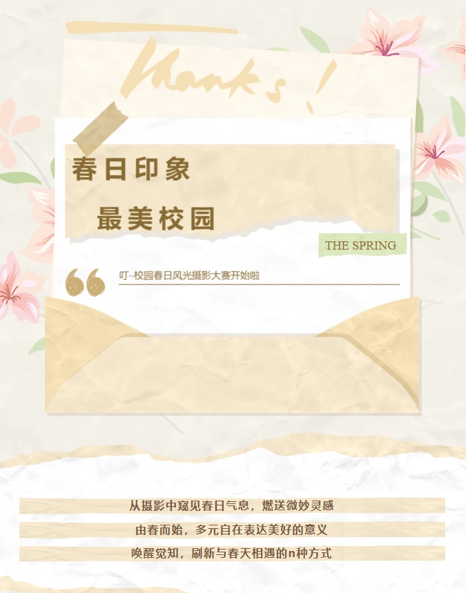 1.投稿作品必須以“春日印象”為主題(可展現校園的美景、人物、活動等。)