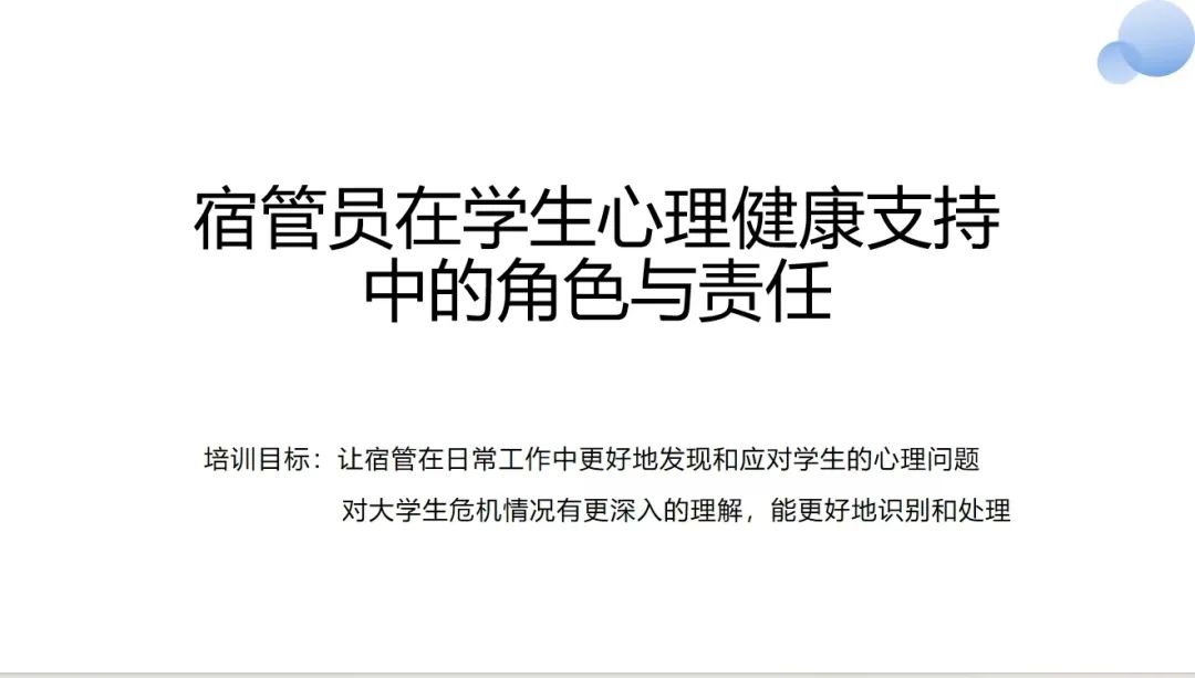 此次培訓旨在提升宿舍管理工作中的心理育人效果,增強宿舍管理員的心理健康專業知識,充分發揮宿舍管理隊伍在學生心理健康工作中的“守門人”作用,助力學生健康成長。講座通過詳細分析宿管員在學生心理危機識別與應對中的重要性,強化了宿舍管理員在學生日常生活中的觀察、信息反饋、聯絡與安全保障等四大關鍵職責。通過實際案例,向他們傳授識別心理危機線索的技能,系統講解了應對突發心理危機的操作流程。