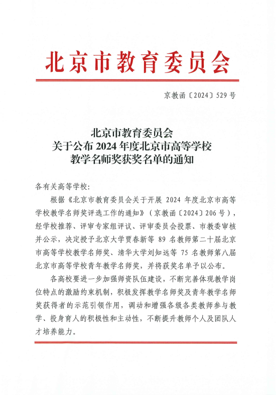 近日,北京市教育委員會在其官方網站發布“關于公布 2024 年度北京市高等學校教學名師獎獲獎名單的通知”。