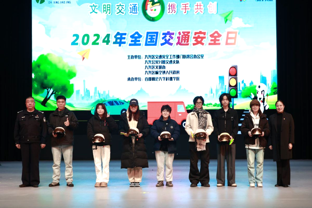 大興區交通支隊副支隊長宋海松與首都師范大學科德學院黨委副書記、副校長陳永俠共同為同學們頒發頭盔獎品。