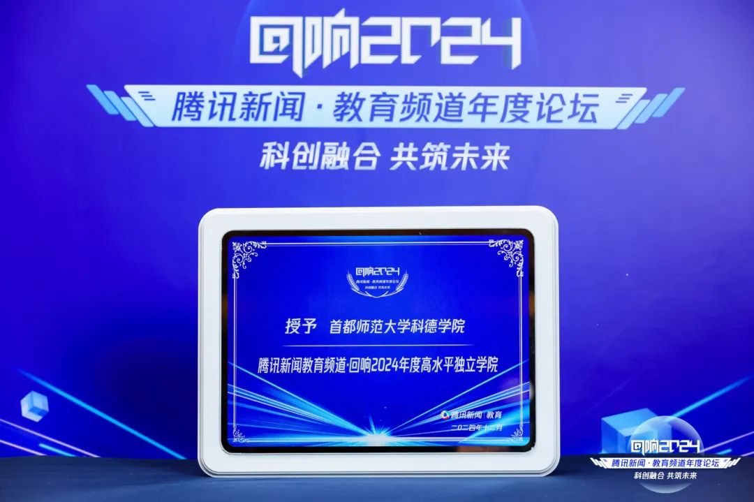 12月5日,2024“回響中國”騰訊新聞•教育頻道年度論壇在北京成功舉行。本屆論壇以 “科技賦能,創新未來” 為主題,匯聚教育界專家學者、行業精英、研究機構、教育媒體與投資人等。共探新時代教育發展路徑,深挖科技變革教育之力,遠瞻創新對社會未來的深遠意義,為教育現代化謀篇布局、注入動能。首都師范大學科德學院憑借創新多元的育人模式、深厚堅實的師資根基與深度融合的國內外優質教育資源,以及在推動應用型創新人才培育與教育行業創新發展進程中所彰顯的卓越成就,榮膺“2024年度高水平獨立學院”榮譽稱號。