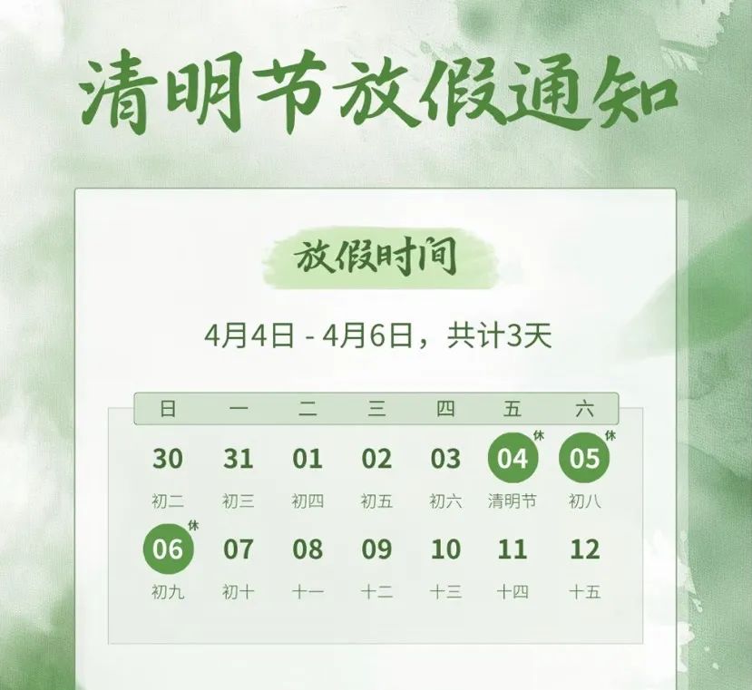 清明節(jié)--2025年4月4日(星期五)至4月6日(星期日)放假共計(jì)3天。2025年4月7日(星期一)全體教職工上班、學(xué)生正常上課。
