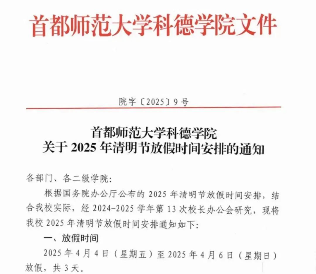根據(jù)國務(wù)院辦公廳公布的2025年清明節(jié)放假時(shí)間安排,結(jié)合我校實(shí)際情況,現(xiàn)將我校2025年清明節(jié)放假時(shí)間安排通知如下:
