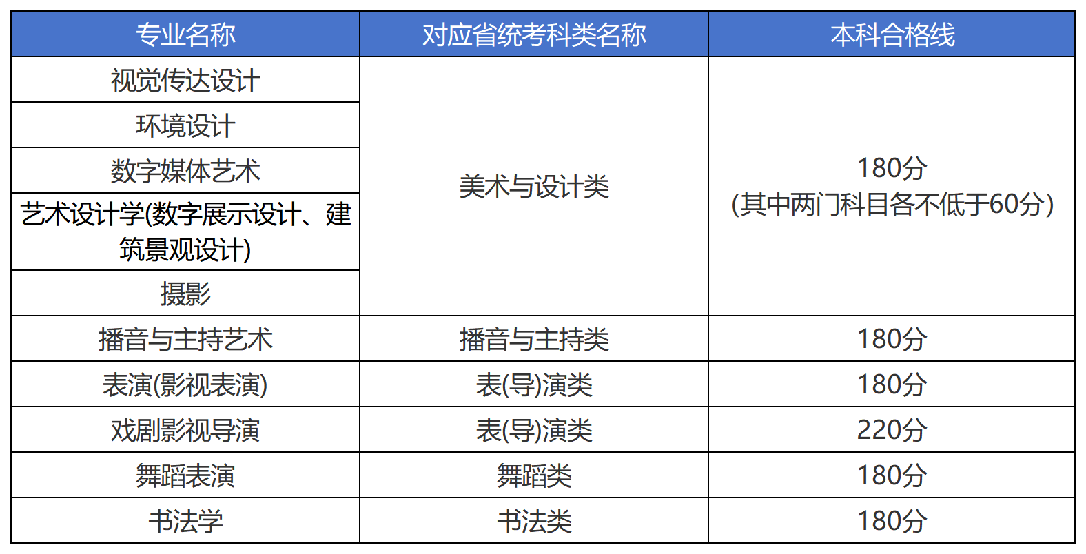 數字媒體藝術、視覺傳達設計、環境設計、藝術設計學、攝影、播音與主持藝術、戲劇影視導演、表演(影視表演)、舞蹈表演、書法學。