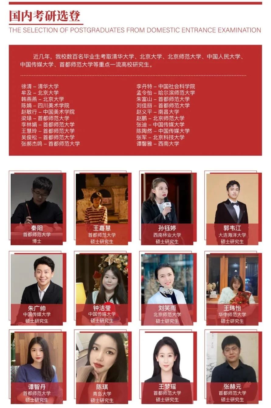 師資優勢隊伍結構優化創新 名師云集學校以清華大學、北京大學、北京航空航天大學、中國人民大學、北京師范大學、北京理工大學、北京交通大學、中國傳媒大學、中央戲劇學院、北京電影學院、中央美術學院、南京大學、首都師范大學及其他國內外重點大學師資為依托,聘請眾多著名學者、藝術家、行業專家在學校任職、授課和講學。目前學校專職專任教師220人,80%以上具有博士和碩士學位,且主要來自前述一流大學。