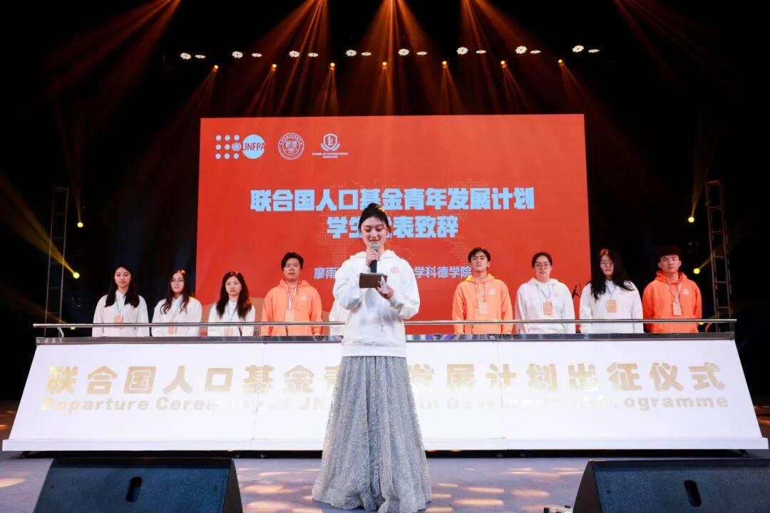 隨后,激動人心的出征啟動儀式將現場氣氛推向高潮。陳永俠副校長與聯合國人口基金UPower計劃項目負責人楊欣怡女士,以及包括廖雨嘉在內的十位即將赴瑞士日內瓦與丹麥哥本哈根參與聯合國人口基金歐洲實習交流項目的青年榜樣影響力校園大使共同登臺,在全場觀眾的見證下開啟這一光榮時刻。這不僅是對學子出征的鄭重祝福,更展現了我校為學子搭建國際舞臺的辦學成果,彰顯了我校推動青年參與全球事務的決心。